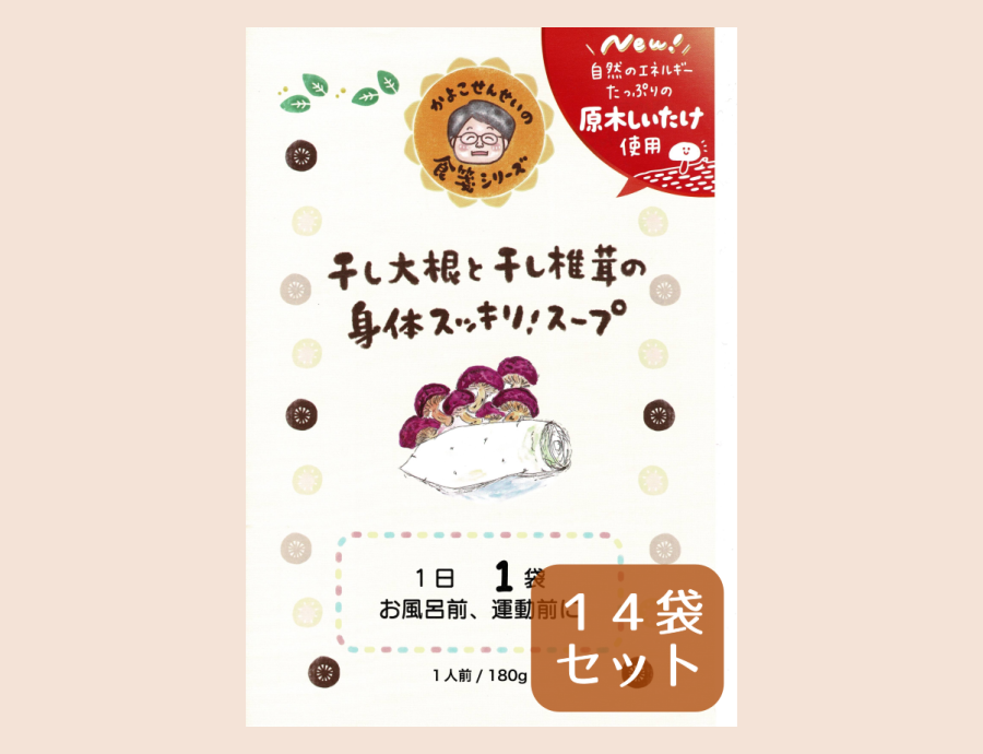 食事の処方箋(食箋)では、定番となっている『干し大根と干し椎茸のスープ』を、みなさんにいつでも手軽に食べていただけるように、天日干しした大根と椎茸(原木)を使用し、無添加で仕上げました。