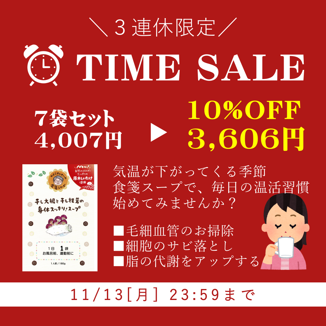 食事の処方箋(食箋)では、定番となっている『干し大根と干し椎茸のスープ』を、みなさんにいつでも手軽に食べていただけるように、天日干しした大根と椎茸(原木)を使用し、無添加で仕上げました。