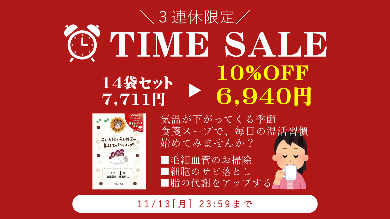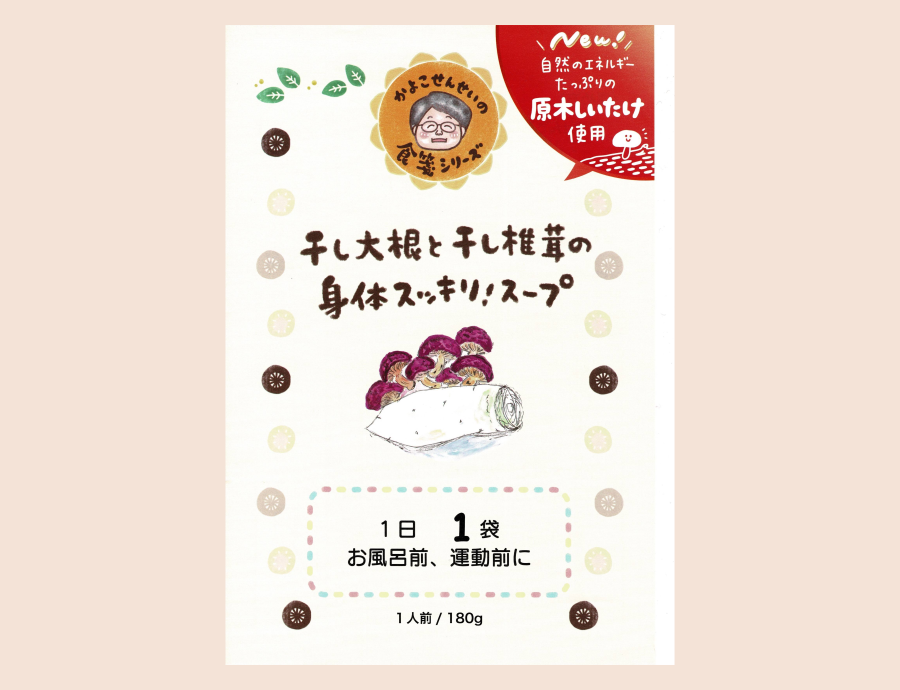 食事の処方箋(食箋)では、定番となっている『干し大根と干し椎茸のスープ』を、みなさんにいつでも手軽に食べていただけるように、よりすぐった大根と椎茸(原木)を使用し、安心安全無添加で仕上げました。